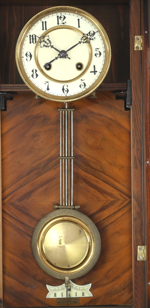 Freiburg (Schwarzwald) 19. Jh. Dreiseitenverglastes Holzgehäuse mit Emaillezifferblatt mit Stundenkreis und Scheibenpendel. Schlag zur halben und vollen Stunde auf Tonfeder. Hinten gemarkt mit AHF im Kreis (Adolf Hummel Regulatoren-Fabrik, Freiburg). Unten Etikett mit Widmung und Datum 1894. Größe ca. 40 x 22 cm, Höhe ca. 92 cm. Altersbedingter Zustand, Fehlteile (Gehäuse), läuft an und schlägt.