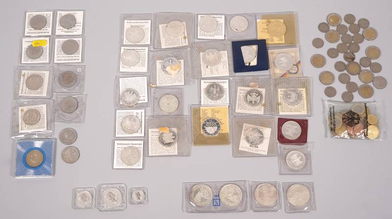 16 x 50 Pfennig + 1 DM, 1 x Euromünzensatz 9 x 2 € Münze. 10 x 5-DM Münze und eine DDR Mark. 22 x 10-DM Münze. 4 x 5 Ecu Belgien Silber. Silbermünzen Australien 25, 50 und 100 $ Koala.