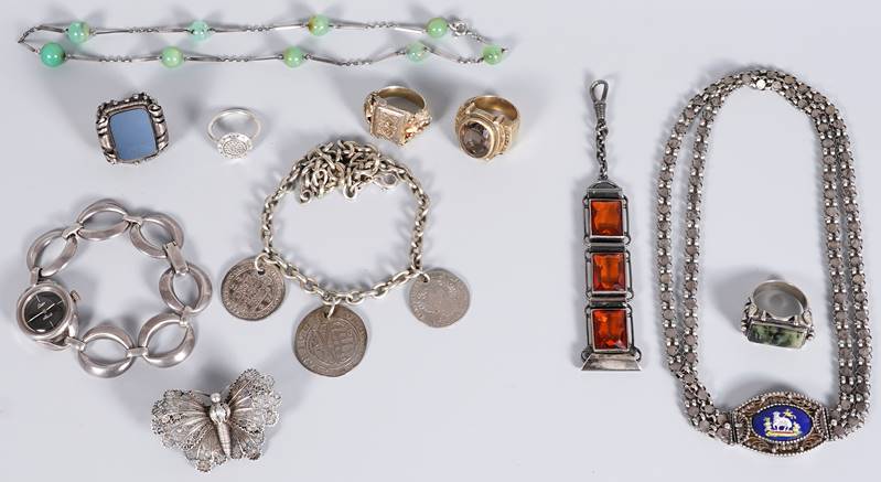 Diverse Teile, teils punziert. Eine Schmetterlingsbrosche (800), eine Kette mit grünen Schmucksteinen (800), eine Damenarmbanduhr von Quinn Scheurle (925), 4 Ringe (800, 2x 900, 925), eine Münzkette mit 3 alten Münzen, 17./18. Jh. Gesamtgewicht ca. 145 Gramm. Drei Teile Silber geprüft: ein Ring mit grünem Schmuckstein, ein Anhänger mit 3 orangenen Schmucksteinen und ein Collier. Dabei ein Ring mit orangefarbenem, ovalem Schmuckstein, eine Brosche mit roten Schmucksteinen, ein Anhänger mit roten Schmucksteinen sowie eine Kette mit Anhänger.