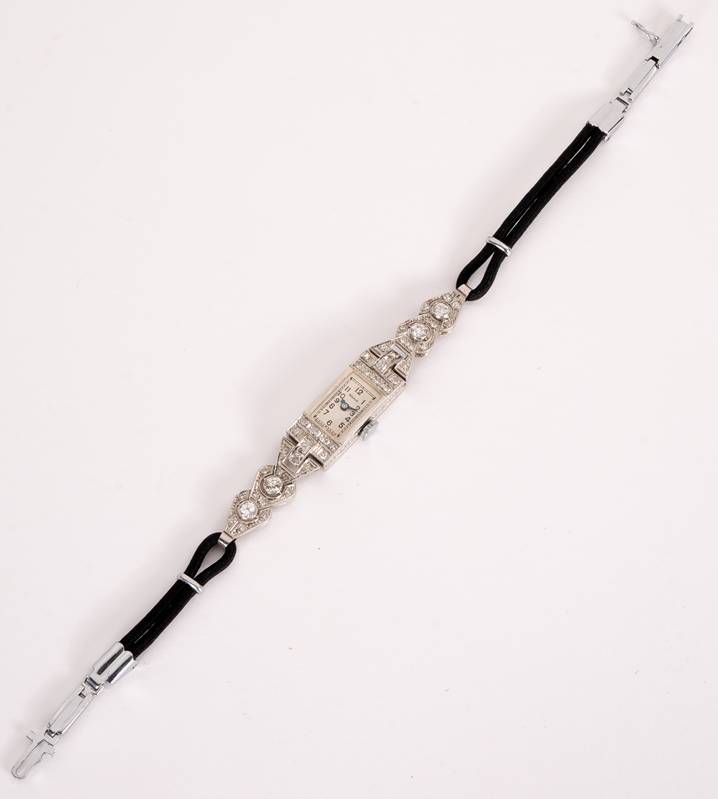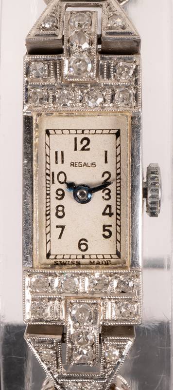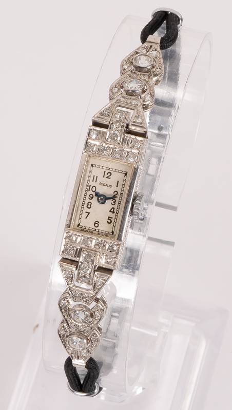 Damenarmbanduhr Regalis, Schweiz 20. Jh. Diamantenbesetztes Platingehäuse (insgesamt ca. 46 Steine, zusammen ca. 1,25 Carat) mit Stoffarmband und unedler Schließe. Rechteckiges Ziffernblatt mit arabischen Stundenzahlen, unter der 12 Herstellerbezeichnung. Handaufzugswerk. Verso auf dem Gehäuse bezeichnet "Platin". Größe des Ziffernblatts ca. 9 x 15 mm, Länge des Armbands ca. 19 cm, Gewicht ca. 12,3 Gramm. Läuft nicht an. (A12)
