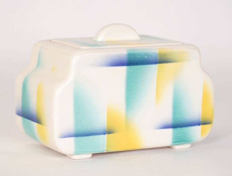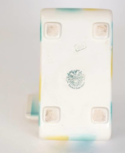Mettlach 1930er Jahre. Villeroy & Boch. Keramik mit typischen Art Deco/Bauhaus Spritzdekor. Unter dem Boden grüne Manufakturmarke sowie Nummer 6261 und 3701. Größe ca. 19 x 1,5 cm, Höhe ca. 12 cm.