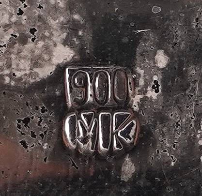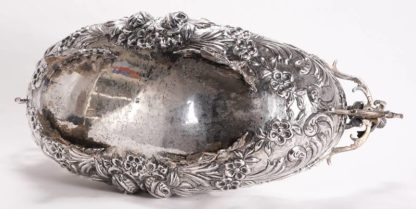 20. Jh. Silber 900 (geprüft). Mit Blumendekor reliefierte Schale mit zwei Handhaben je gekrönt von einem Putto. Unter dem Boden Feingehaltspunze und Herstellerpunze MK. Größe ca. 46 x 17 cm, Höhe ca. 23 cm. Gewicht ca. 1400 Gramm. Schöne Patina.