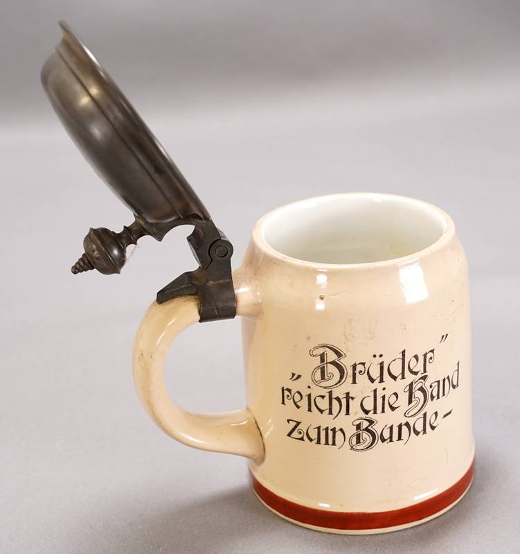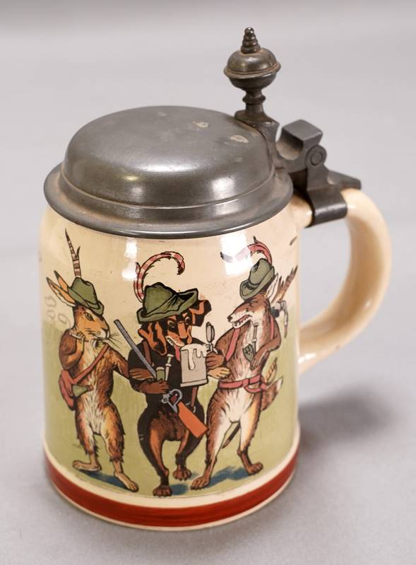 20. Jh. Steinzeug mit Zinnmontur. 0,5l Krug mit schauseitiger Darstellung von Hase, Dackel und Fuchs Arm in Arm in Jägerstracht, verso mit Spruch "Brüder reicht die Hand zum Bunde-". Unter dem Boden mit Manufakturmarke sowie Dekornummer 1292 und Formnummer 1526. Durchmesser ca. 9,5 cm, Höhe ca. 17 cm.