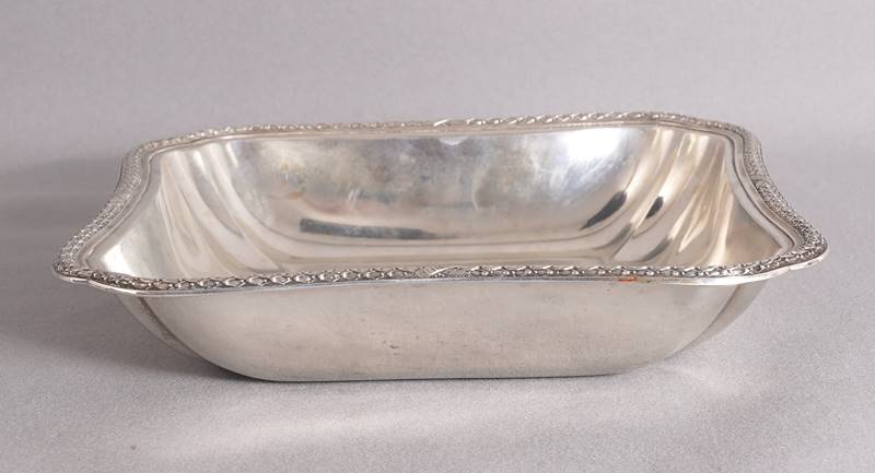 Silberschale Deutsch Anfang 20. Jh. Silber 800. Quadratische Schale, tief gemuldet, mit reliefiertem Blattdekor entlang des Randes. Unter dem Boden punziert mit Halbmond und Krone, Feingehalt 800, Nummerierung 9718 und weiteren Punzen, ungedeutet. Größe ca. 20 x 20 cm, Höhe ca. 4 cm. Gewicht ca. 350 Gramm.