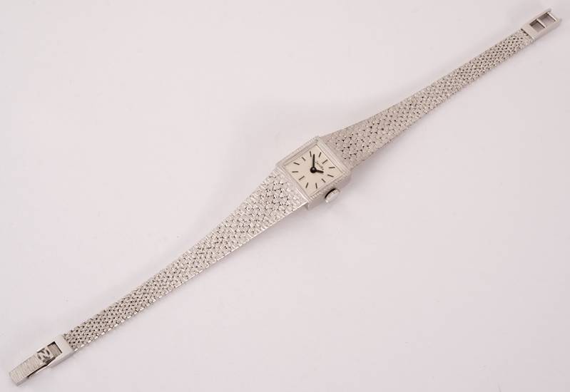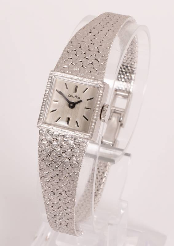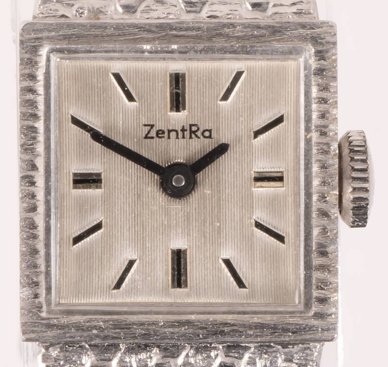 Damenarmbanduhr ZentRa. Weißgold 585. Quadratisches Ziffernblatt, unter der Zwölf mit Herstellerbezeichnung. Handaufzugswerk. Fein strukturiertes Goldarmband. Auf dem Uhrendeckel und Schließe punziert. Größe des Ziffernblatts ca. 11 x 11 mm, Länge ca. 17 cm, Gewicht ca. 25,1 Gramm. Läuft nicht an. (A37)