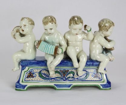 für die Karlsruher Majolika 1904. Vier musizierende Putten. Vgl. Karlsruher Majolika 1901 - 2001, Seite 83. Im Sockel gemalte Manufakturmarke und Formnummer R 136 sowie originale Etiketten. Größe ca. 21 x 9 cm, Höhe ca. 14,5 cm. Teils etwas best.