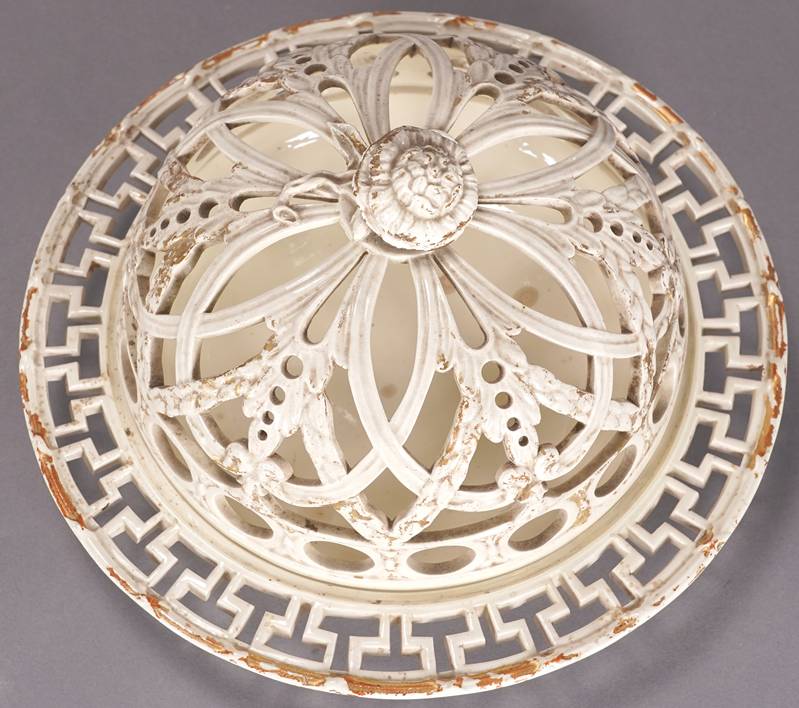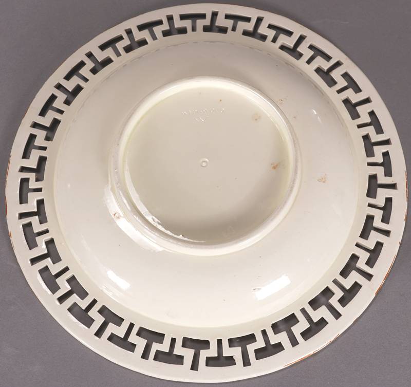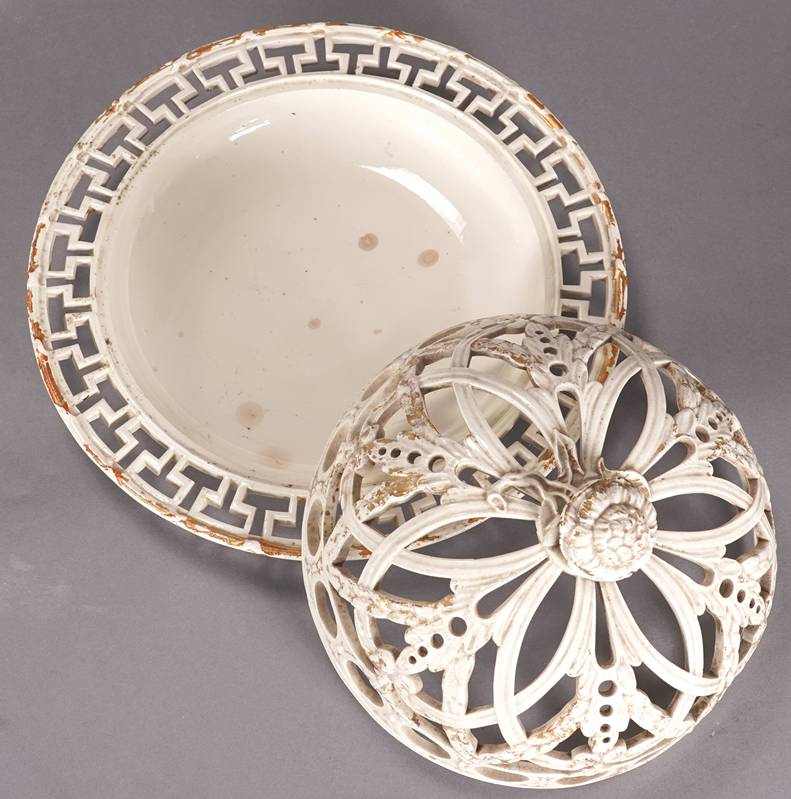 Wegdwood Schale Wedgwood 19. Jh. Porzellan mit Resten alter Goldstaffage. Orange Bowl mit durchbrochen gearbeitetem Deckel und Boden mit durchbrochen gearbeiteter Fahne. Unter dem Boden gepresste Marke. Durchmesser ca. 25 cm, Höhe ca. 14 cm. Altersbedingter Zustand wie abgebildet.