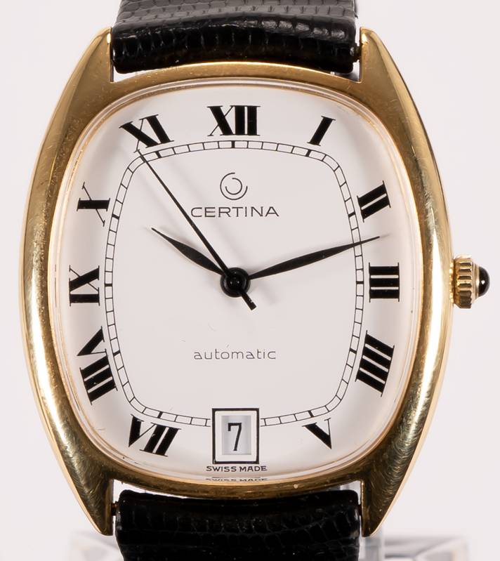 Certina Armbanduhr Gelbgold 750. Weißes Ziffernblatt mit Datum auf der Sechs und Herstellerbezeichnung unter der Zwölf. Automatikwerk. Lederarmband. Im Uhrdeckel punziert. Größe des Ziffernblatts ca. 3 x 2,7 cm, Länge ca. 22 cm. Gewicht ca. 37,1 Gramm. (A56)
