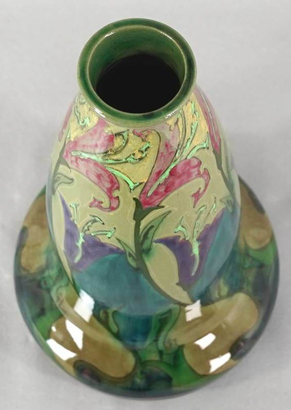 Gegründet 1898, Gouda. Jugendstilvase. Keramik mit Unterglasurbemalung. Unter dem Boden bezeichnet Made in Zuid Holland und nummeriert, sowie altes Etikett. Durchmesser ca. 15,5 cm, Höhe ca. 30,5 cm. Gewicht ca. 0,8 kg. Mit Craquelé.