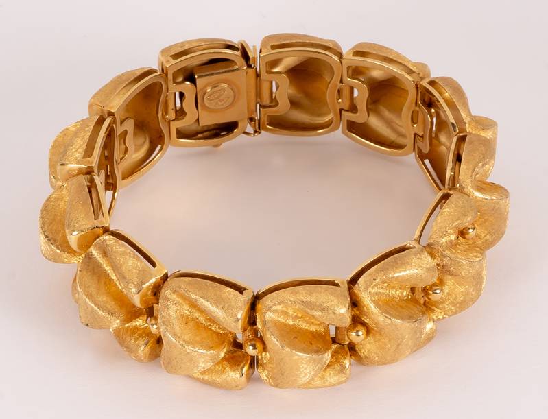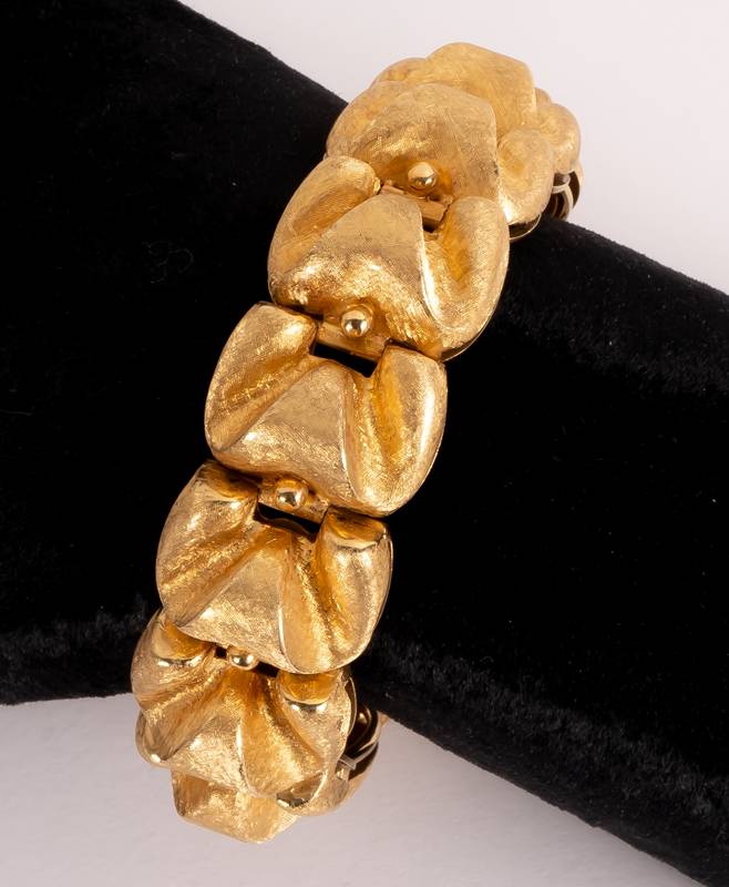 Gelbgold 750. , Voluminöse, satinierte Fantasieglieder mit Kastenschließe und Sicherungsacht. Auf der Schließe punziert. Länge ca. 19,5 cm, Gewicht ca. 64,7 Gramm. (A18)