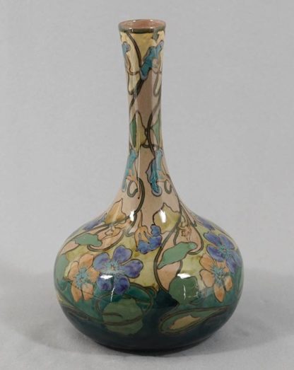 Plateelbakkerij Zuid Holland Gegründet 1898, Gouda. Jugendstilvase. Keramik mit Unterglasurbemalung. Unter dem Boden bezeichnet Made in Zuid Holland und nummeriert. Durchmesser ca. 18 cm, Höhe ca. 30 cm. Gewicht ca. 0,8 kg. Mit Craquelé.