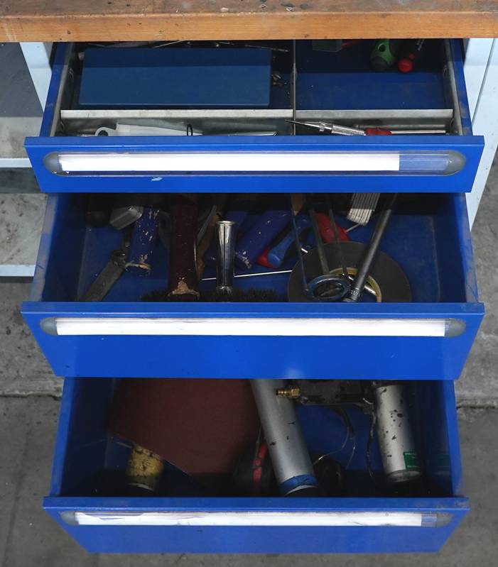 Rollbare Werkbank mit diversem Werkzeug. Ca. 140 x 70 cm.