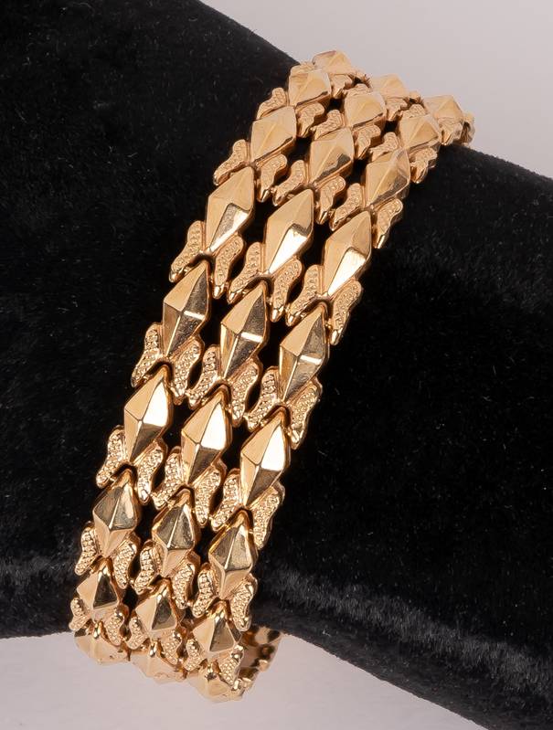 Gelbgold 750. Breites Armband im Fantasiemuster mit Kastenschließe und Sicherungsacht. Auf der Schließe punziert. Länge ca. 19 cm, Gewicht ca. 21,2 Gramm. (A19)
