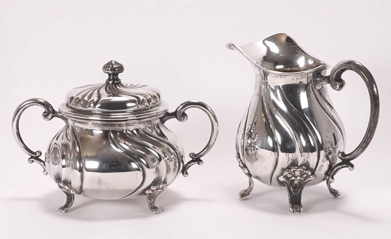 Hermann Emil, Waldstetten 20. Jh. Silber 835. Barockisierte Form. Teekanne, Kaffeekanne, Milchgießer und Zuckerdose. Je unter dem Boden punziert mit Halbmond und Krone, Feingehalt und Herstellerpunze. Größe der Kaffeekanne ca. 27 x 14 cm, Höhe ca. 23,5 cm. Gesamtgewicht ca. 1910 Gramm. Zustand wie abgebildet, schöne Patina.