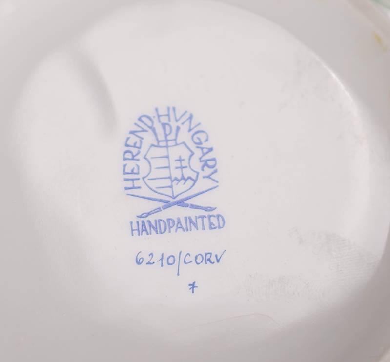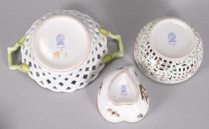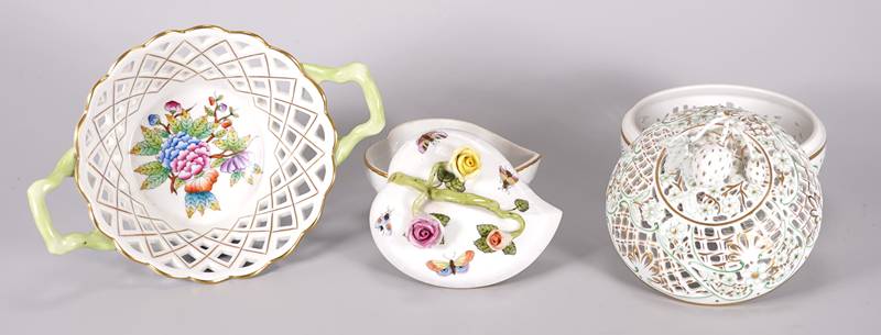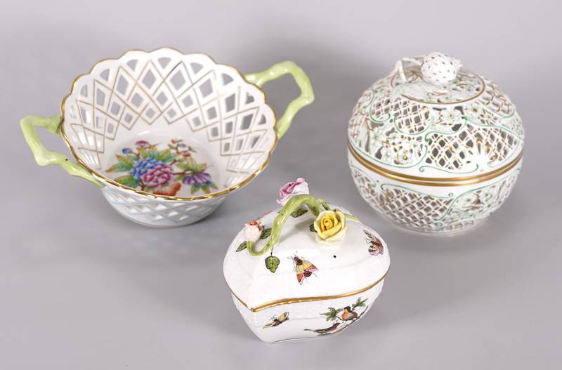 Porzellanmanufaktur Herend, Ungarn. Eine Schale und eine Deckeldose mit Dekor "Bouquet des Fruits" mit Goldstaffage und eine Potpourri mit durchbrochen gearbeiteter Wandung und Deckel, Dekor in Grün und Goldstaffage. Je unter dem Boden mit grüner Herstellermarke. Durchmesser des Potpourris ca. 12,5 cm, Höhe ca. 13 cm. Deckelrosen minimal bestoßen.