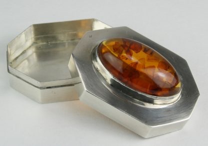 Wohl deutsch 1930er Jahre. Silber. Achteckige Dose mit großem Bernstein im Deckel. Verschlagene Silberpunzen. Größe ca. 7,5 x 5,5 cm, Höhe ca. 4 cm, Gewicht ca. 103 Gramm.