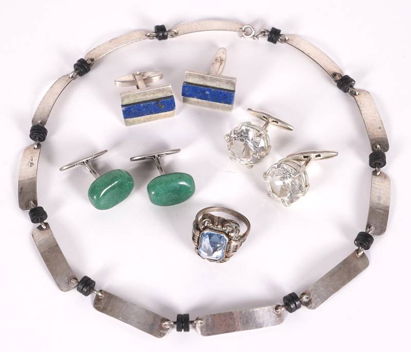 Drei Paar Manschettenknöpfe, je mit Schmuckstein, je punziert 835, ein Ring mit blauem Schmuckstein, punziert 935, und eine Kette aus Silberplatten und schwarzen Scheiben, punziert 800. Gesamtgewicht ca. 58 Gramm. Zustand wie abgebildet.