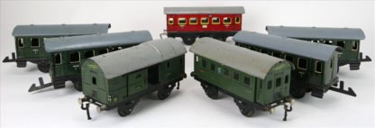 Sieben diverse Güterwagen, meist Fleischmann späte 1940-er Jahre. Altersbedingter Zustand wie abgebildet.