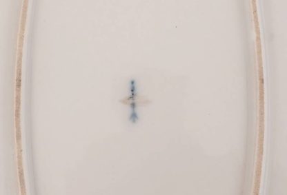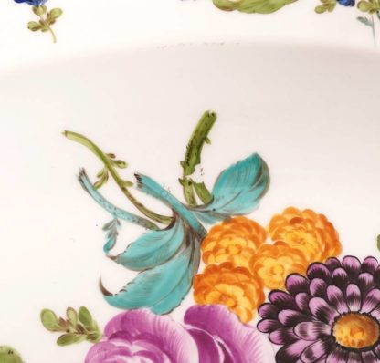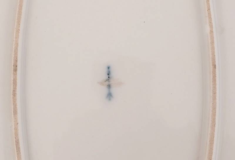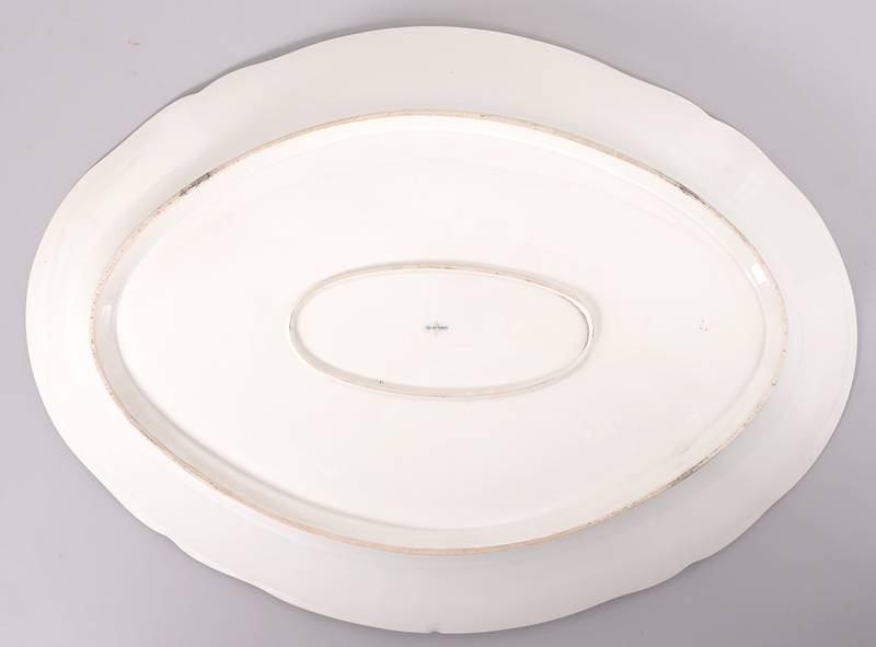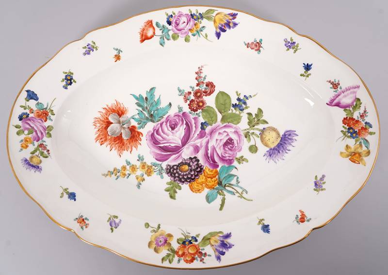Königliche Porzellanmanufaktur Berlin 19. Jh. Ovale Form mit geschwungenem Rand. Blumenmalerei und Goldrand. Unter dem Boden unterglasurblaue Zeptermarke mit einem Schleifstrich sowie gepresstes PW. Größe ca. 49 x 36 cm, Höhe ca. 6 cm. Am äußeren Rand bestoßen, in der Malerei minimal beschädigt.