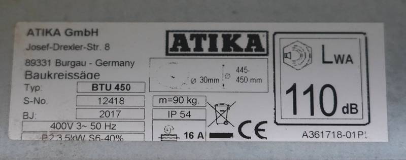 Baukreissäge Atika 400 Volt. WTU 450.