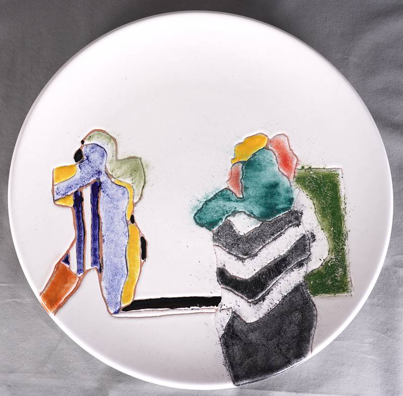 Berges, Werner 1941 Cloppenburg - 2017 Schallstadt. Keramikteller mit polychromem Dekor. Zwei Figuren, reliefartig gearbeitet und polychrom gefasst. Verso signiert und wohl datiert oder nummeriert. Durchmesser ca. 36,8 cm.