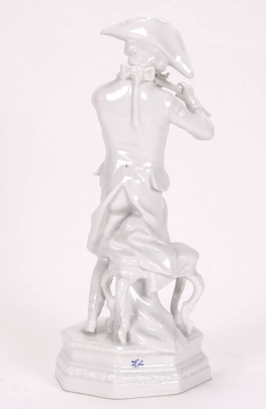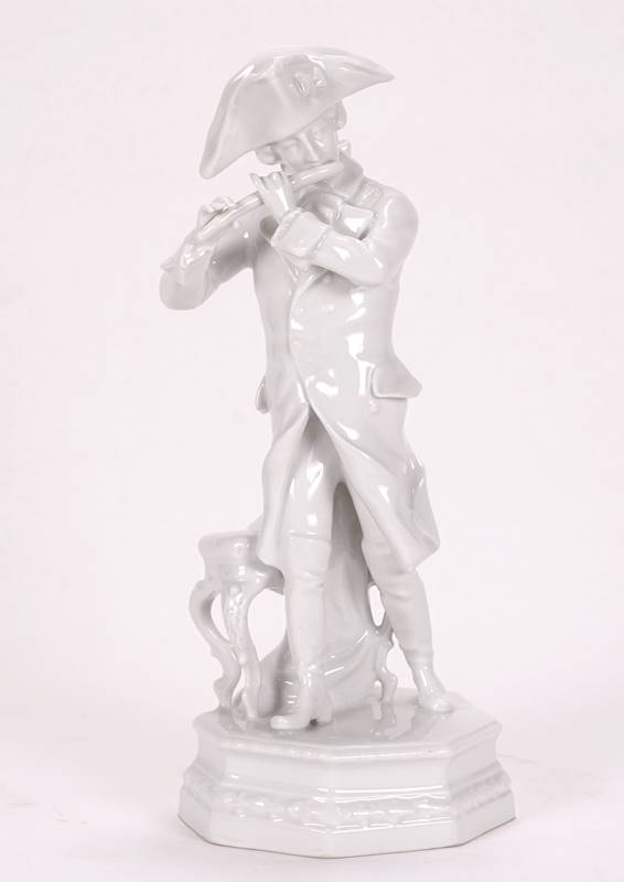 Friedrich der Große mit Flöte Porzellanmanufaktur Scheibe-Alsbach. Porzellan. Hinten am Sockel Manufakturmarke mit einem Schleifstrich sowie Formnummer, auf dem Sockel monogrammiert KA. Größe ca. 10 x 9 cm, Höhe ca. 25 cm.