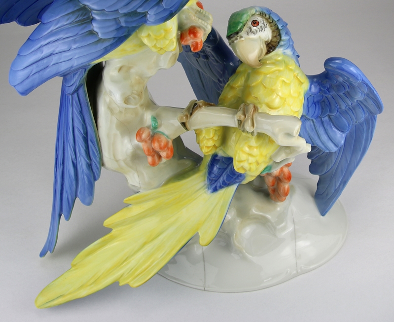 1873 Neuhaus am Rennweg- 1948 Dresden. Hutschenreuther. Bunt gefasstes Papageienpaar. Unter dem Boden grüne Manufakturmarke und Formnummer. Größe ca. 28 x 15 cm, Höhe ca. 29 cm, Gewicht ca. 2,2 kg. Zwei wohl produktionsbedingte Risse, ansonsten guter Zustand.