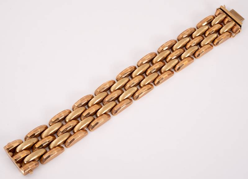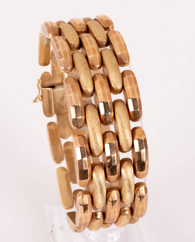Gold 585. Breites Armband im Fantasiemuster, teils satiniert, Kastenschließe und doppelter Sicherungsacht. Auf der Schließe punziert. Länge ca. 19 cm, Gewicht ca. 48,5 Gramm. (A28)