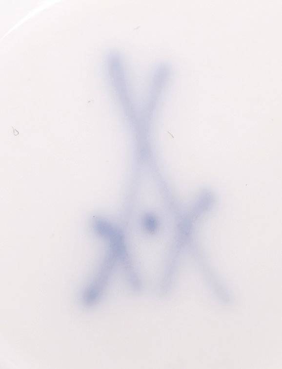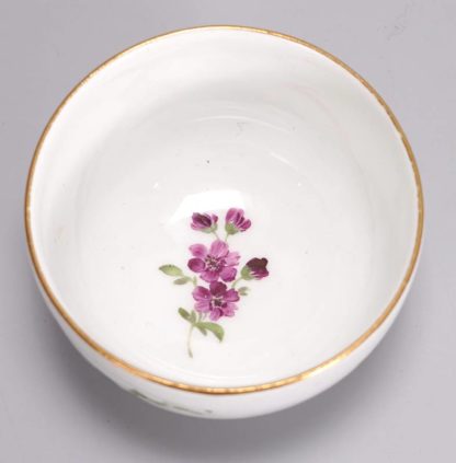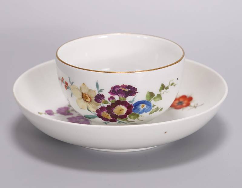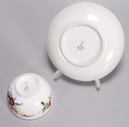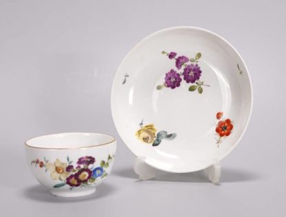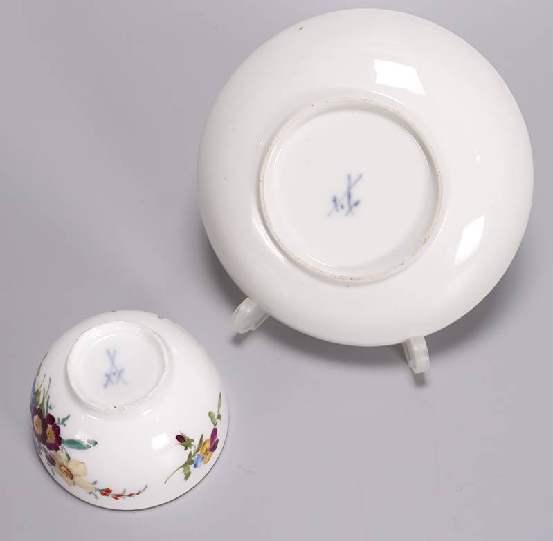 Königliche Porzellanmanufaktur Meissen 18. Jh. Koppchen und Untere mit polychromem Blumendekor und Tasse mit Goldrand. Jeweils unter dem Boden mit unterglasurblauer Schwertermarke mit Punkt unten. Durchmesser Untere ca. 13,2 cm, Durchmesser Koppchen ca. 8 cm, Höhe ca. 4,5 cm. Goldrand und Malerei teils leicht berieben. Stand der Tasse und Unteren leicht bestoßen.