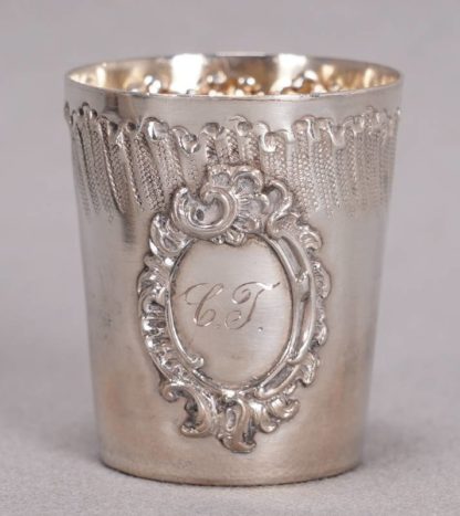 Sechs Silberbecher Deutsch 20. Jh. Silber 950, innen ausvergoldet. Sechs kleine Schnapsgläser mit umlaufendem Dekor und jeweils einem Medaillon auf der Schauseite, darin ein Monogramm C.T. Unter dem Boden jeweils punziert mit Halbmond und Krone, sowie Feingehalt 950. Durchmesser ca. 3,5 cm, Höhe ca. 4 cm. Gesamtgewicht ca. 127 Gramm. Teils mit leichten Gebrauchsspuren.