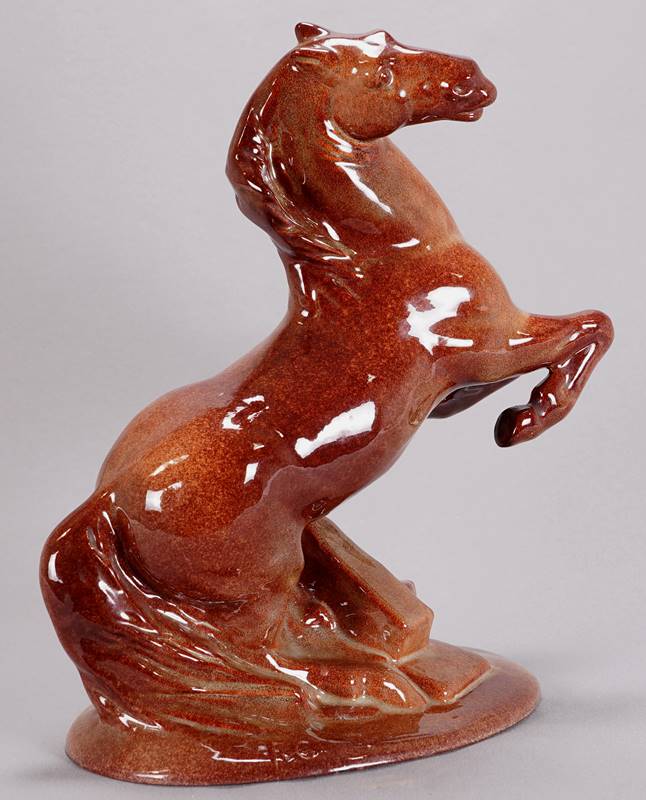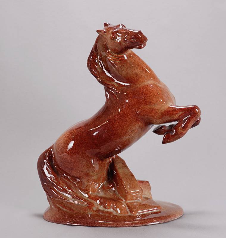1892 Stuttgart - 1959 Gerlingen. Keramik, roter Scherben mit Glasur. Steigendes Pferd. Auf dem Sockel monogrammiert FvG. Größe ca. 32 x 15 cm, Höhe ca. 35 cm. Unter dem Boden teils Risse, teils entlang des Standes am Rand bestoßen.