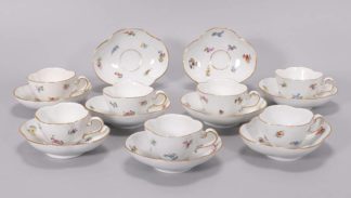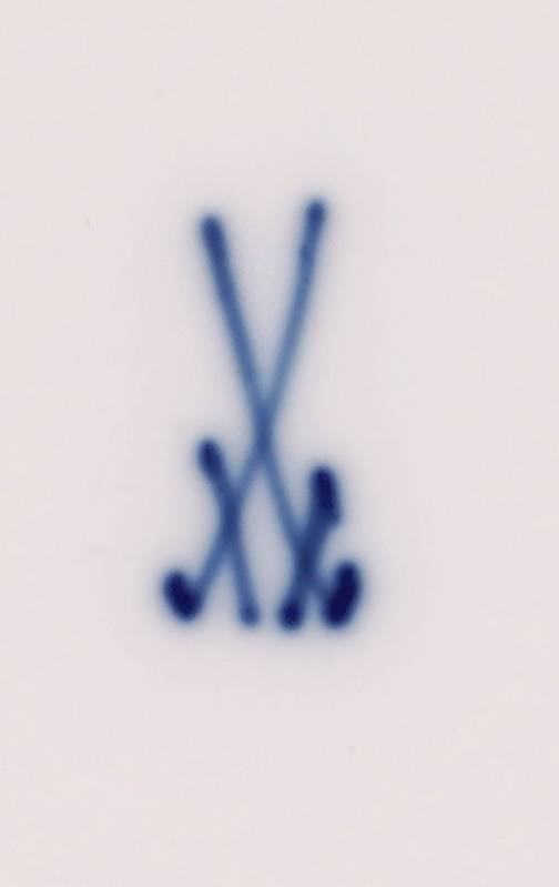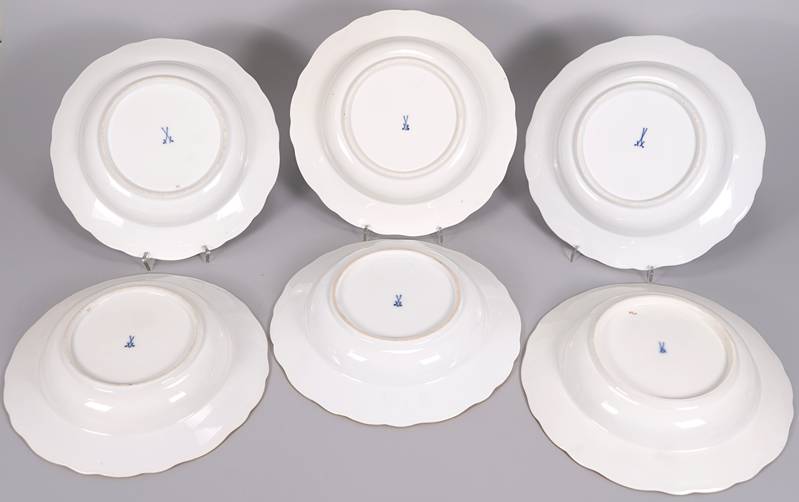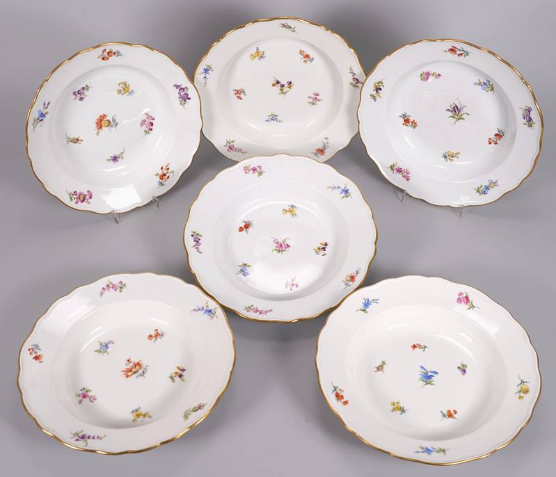 Porzellanmanufaktur Meissen um 1900. Form Neuer Ausschnitt, Dekor mit Streublumen. Unter dem Boden unterglasurblaue Schwertermarke, meist Knaufschwerter 1. Wahl, und Formnummer. Durchmesser ca. 23,5 cm, Höhe ca. 5 cm.
