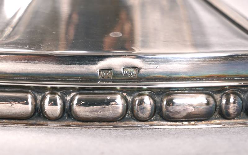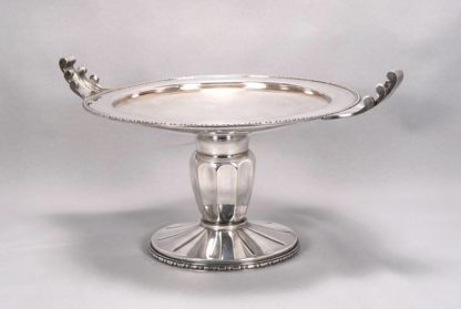 Wohl deutsch 20. Jh. Versilbert. Runde Schale mit zwei Handhaben auf balusterförmigem, kanneliertem Schaft auf rundem Fuß. Auf dem Fuß mit Meistermarke RM und Auflagenpunze 20. Durchmesser ca. 33 cm, Höhe ca. 20 cm. Gewicht ca. 1,8 kg. Altersbedingter Zustand mit Patina wie abgebildet. Silberauflage teils berieben.