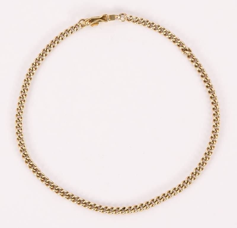 Gold 585. Feines Armband mit Panzerkettengliedern, Kastenschließe und Sicherungsacht. Auf der Schließe punziert. Länge ca. 20 cm, Gewicht ca. 4,2 Gramm. (A30)