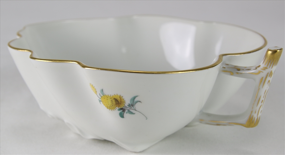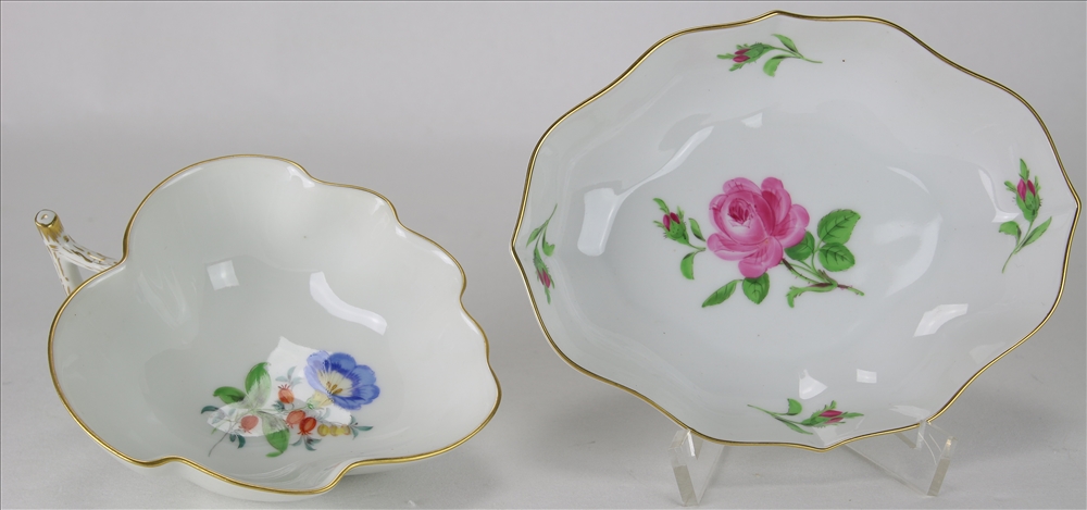 20. Jh. Form Neuer Ausschnitt mit Blumendekor. Porzellan mit reicher Malerei und Goldrändern. Blattschale (ca. 13 x 10,5 cm), Konfektschale (ca. 15,5 x 12 cm). Jeweils unterglasurblaue Zeptermarke mit zwei Schleifstrichen und weitere Marken. Guter Zustand.