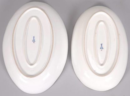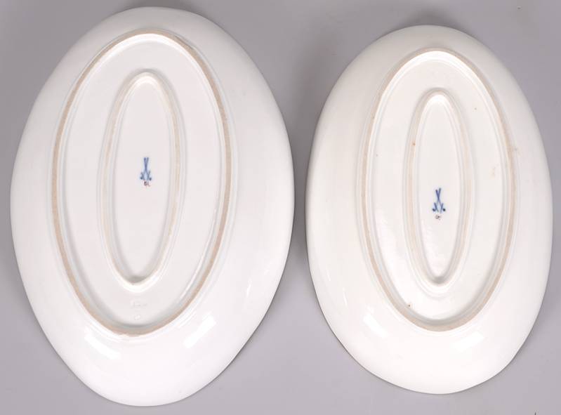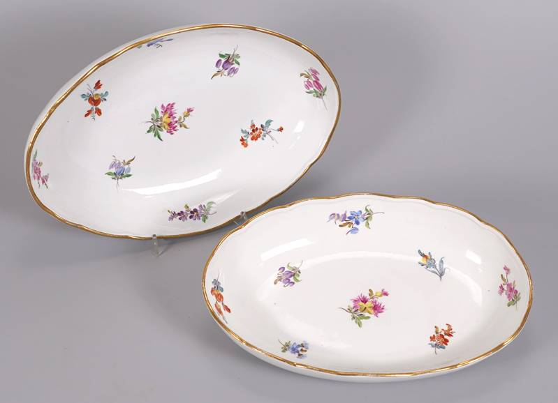 Zwei Schalen Meissen Porzellanmanufaktur Meissen um 1900. Form Neuer Ausschnitt, Dekor Streublumen mit Goldrand. Zwei ovale Schalen verschiedener Größe. Je unter dem Boden mit unterglasurblauer Knaufschwertermarke, 1. Wahl, Malermarke und Formnummer. Größe ca. 23,5/25,5 x 15/17,5 cm, Höhe ca. 4/4,5 cm. Goldrand teils berieben.