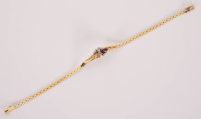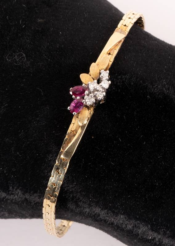 Gold 585. Gelbgold-Armband in Flachpanzerkettenvariation mit zentralem Weißgold-Element besetzt mit zwei Navett-Rubinen (zusammen ca. 0,3 Carat) und fünf Achtkantdiamanten (zusammen ca. 0,1 Carat). Kastenschließe mit Sicherungsacht. Auf der Schließe punziert. Länge ca. 18 cm, Gewicht ca. 7,1 Gramm. (A49)