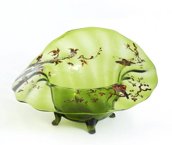 Kapitale Glasschale Wohl Italien um 1910. Grüne Glasschale mit breiter stark gewellter Fahne und Vogeldekor in Erdfarben. Größe ca. 61 x 68 cm, Höhe ca. 35 cm. Die Fahne ist teils best.