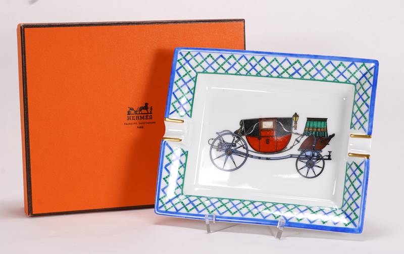Paris um 2000. Porzellan, polychrom gefasst und goldstaffiert. Rechteckige Form. Rand mit Gittermuster, im Spiegel die Abbildung einer Kutsche aus dem 19. Jh. Die Zigarettenablage mit Gold markiert. Außen am Rand bezeichnet, unter dem Boden Prägemarke. Größe ca. 20 x 16,5 cm, Höhe ca. 4 cm. In Original-Box.