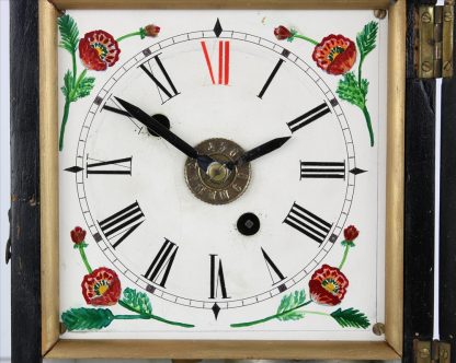 Um 1900. Ebonisiertes Holzgehäuse mit Frontverglasung und bemaltem Metallschild. Pendulenwerk mit Weckerwerk mit Schlag auf Glocke. Größe ca. 17,5 x 12 cm, Höhe ca. 23,5 cm. Altersbedingter Zustand wie abgebildet, läuft an, Wecker läutet.