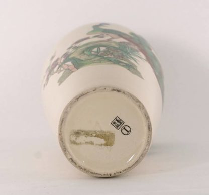 20. Jh. Weiße Keramik, runde Form, die sich nach unten verjüngt, handbemalt. Darstellung eines prächtigen Pfaus mit violetten Blüten zu seiner Rechten. Unter dem Boden gemarkt. Durchmesser ca. 11 cm, Höhe ca. 26 cm.