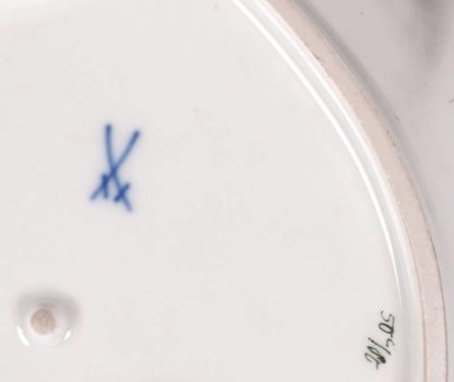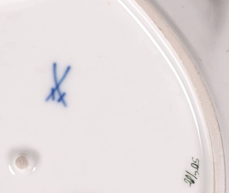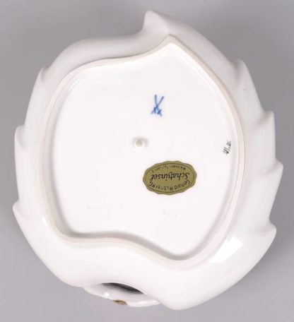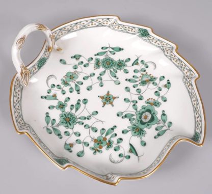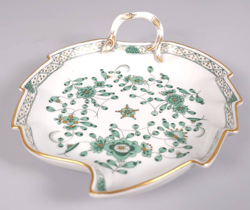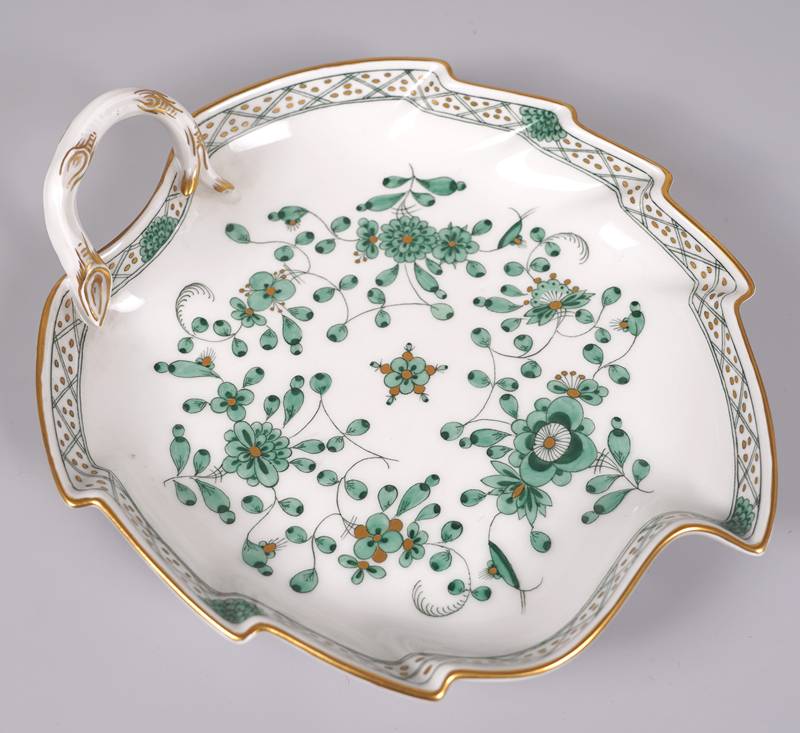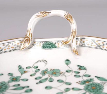 Porzellanmanufaktur Meissen 20. Jh. Form Neuer Ausschnitt, Dekor Indisch grün mit Goldstaffage. Unter dem Boden unterglasurblaue Schwertermarke (1. Wahl), Modellnummer und Malermarke, sowie ein Händleretikett. Größe ca. 19 x 17,5 cm.