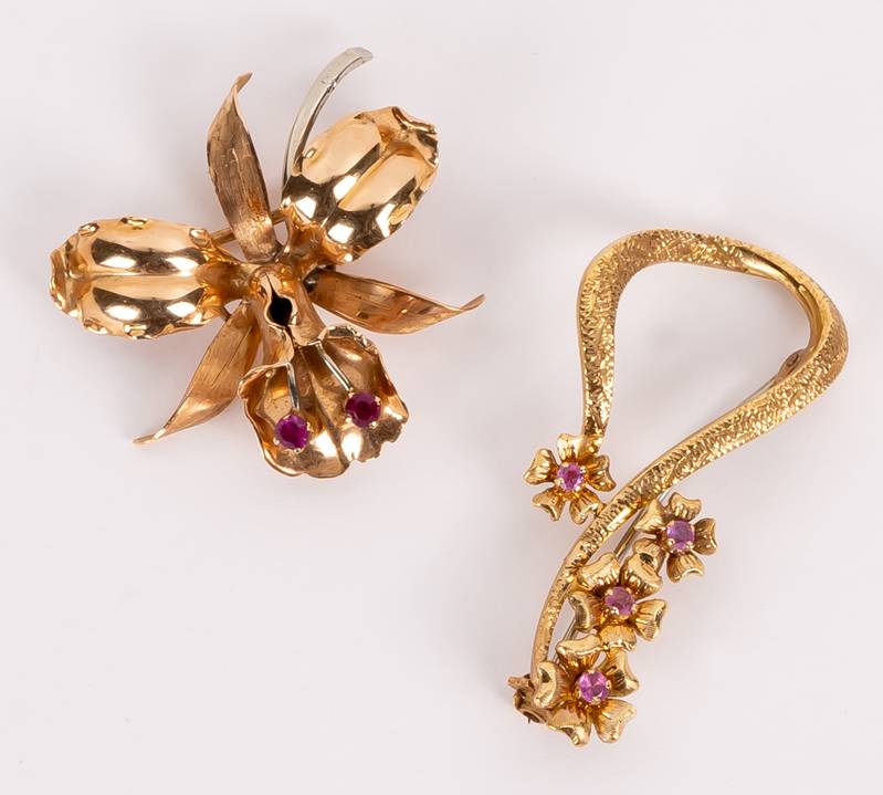 Gelbgold 750. Eine Schleifenbrosche mit Blüten besetzt mit vier kleinen Rubinen, verso punziert. Eine Blütenbrosche mit zwei kleinen, synthetischen Rubinen, verso punziert. Größe ca. 2/3 x 4/3,5 cm. Gesamtgewicht ca. 10,6 Gramm. (A25)