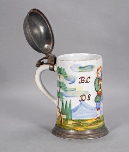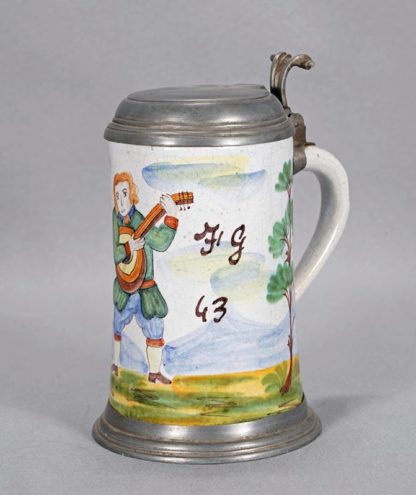 Deutsch, wohl 18. Jh. Hoher Krug mit polychromer Darstellung eines Gitarrenspielers, zu beiden Seiten bezeichnet. Keramik mit Zinnmontur an Standring und Deckel. Verschlagene Punze auf Deckel. Unter dem Boden eingeritzte Marke. Größe ca. 17 x 13 cm, Höhe ca. 20,5 cm. Altersbedingter Zustand, teils beschädigt. Bitte selbst besichtigen.