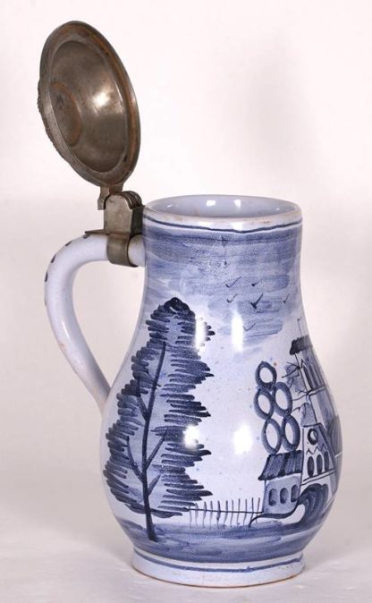 Birnkrug Hanau 18. Jh. Steinzeug mit weiß-blauer Fayence und Zinndeckel. Landschaft mit Bäumen und Architektur. Unter dem Boden gemarkt mit 80. Größe ca. 16 x 13 cm, Höhe ca. 21 cm. Deckel wohl beschädigt.