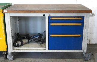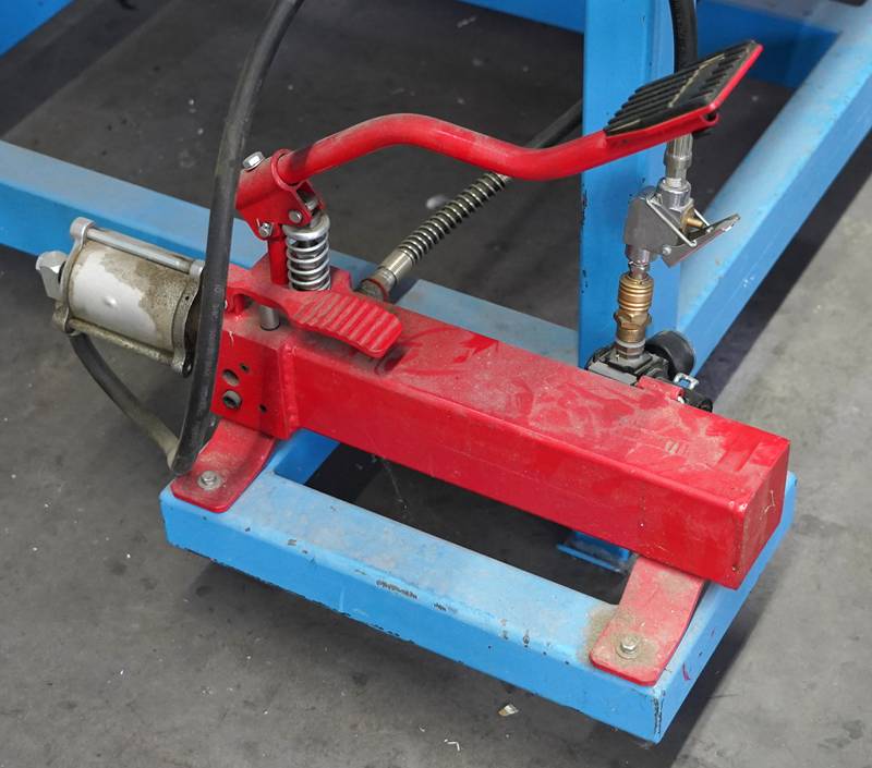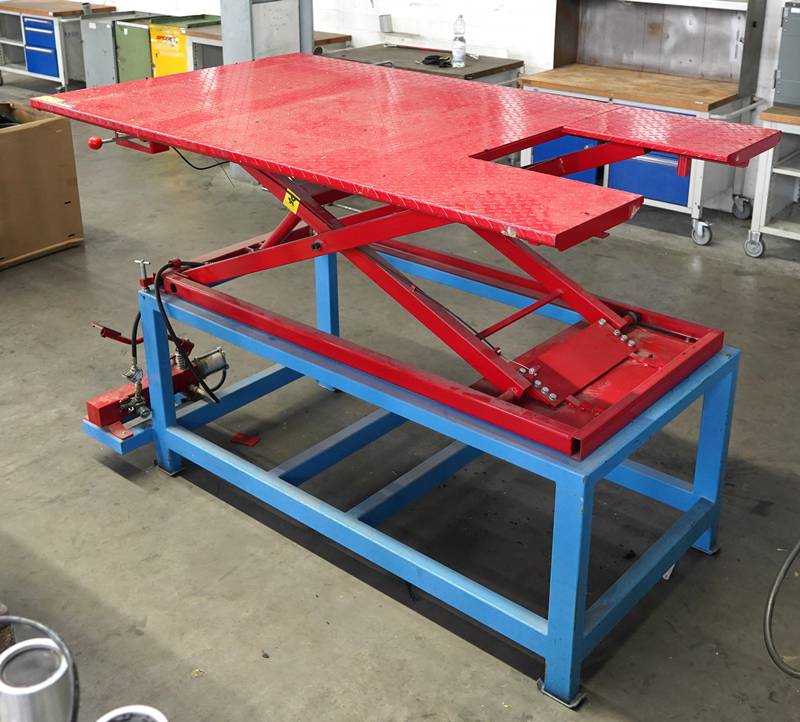 Hydraulische Hebebühne DEMA QH 680. Tischgröße ca. 200 x 120 cm, Höhe variabel. Auf Tisch montiert, Höhe ca. 70 cm.
