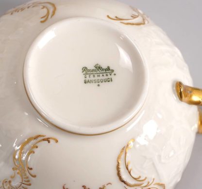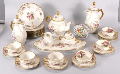 Rosenthal 20. Jh. Porzellan. Dekor Sanssouci Elfenbein Diplomat mit Goldrand. Insgesamt ca. 28 Teile. Bestehend aus: Kaffee-, Tee- und Mokkakanne, Sahnegießer, Zuckerschale, Kuchenplatte, 6 Teetassen, 8 Untere, 8 Dessertteller. Teils leicht berieben. Größe der Kaffeekanne ca. 17 x 12 cm, Höhe ca. 25 cm, Teekanne ca. 26 x 15 cm, Höhe ca. 20 cm, Mokkakanne ca. 15 x 10 cm, Höhe ca. 22 cm. Dabei eine Deckelschale der Sächsischen Porzellanmanufaktur Dresden. Diese ist an den Blütenapplikationen teils bestoßen.