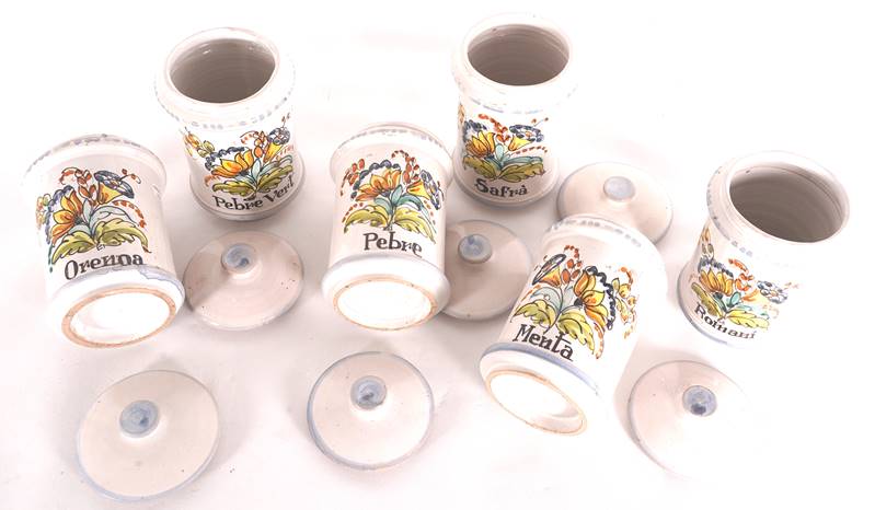 Katalonien 20. Jh. Keramik polychrom gefasst. Dosen mit Deckel. Jeweils auf Schauseite mit Blumenbuket, darunter Gewürzbezeichnung auf Katalanisch. Größe ca. 9 x 9 cm, Höhe ca. 15 cm. Ein Deckel ist am Rand minimal best.