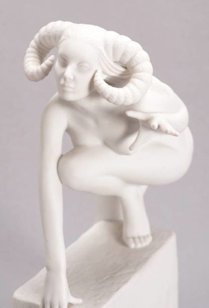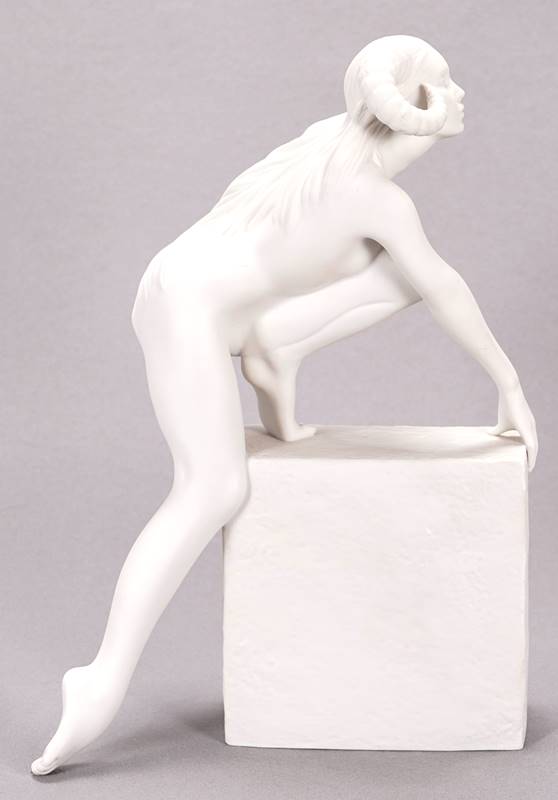 Königlichen Porzellanmanufaktur, Kopenhagen, 20. Jh. Biskuitporzellan. Weibliche Widder Figur aus der Sternzeichenserie von Royal Copenhagen. Nach dem Entwurf der dänischen Künstlerin Christel Marott (1919-1992). Unter dem Boden grüne Manufakturmarke, blaue Wellenmarke, Bezeichnung und Signatur Aries Design: Christel, sowie Nummerierung 1249 102. Größe ca. 19 x 10 cm, Höhe ca. 26,5 cm. Minimalst berieben an der Unterseite des ausgestreckten Fußes.