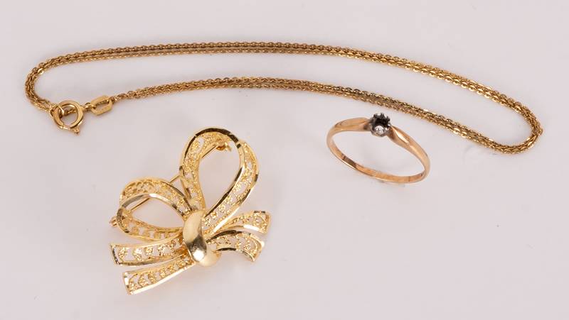 Gold 585. Eine Kette, eine Schleifenbrosche und eine Ringfassung. Je punziert. Gesamtgewicht ca. 6,8 Gramm. (A52)